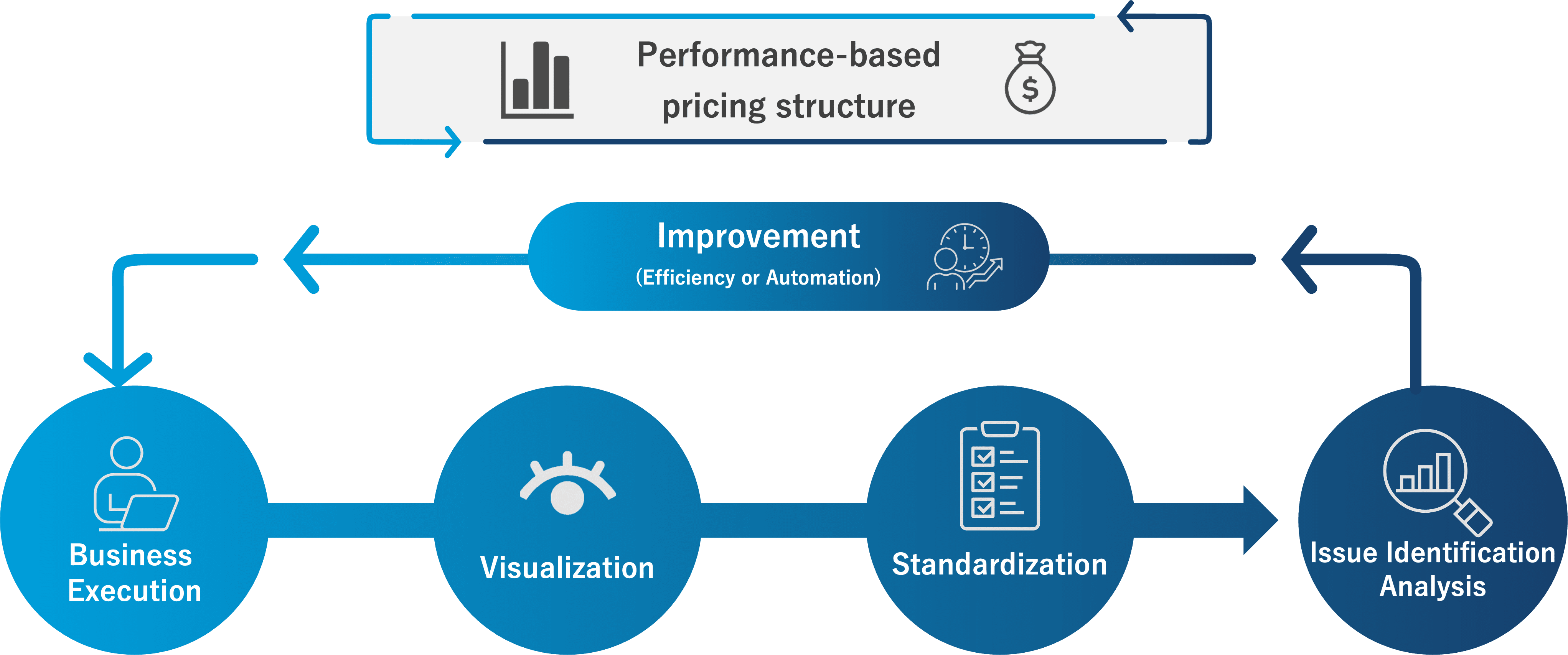 Using the BPMN methodology, we visualize the improved business processes (To Be) at task-level resolution. Manuals (business overviews) and work procedure manuals are also updated to maintain the latest status.Performance-based pricing structure