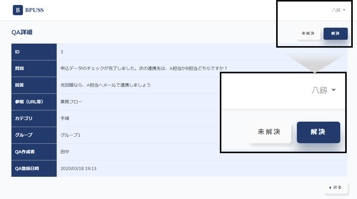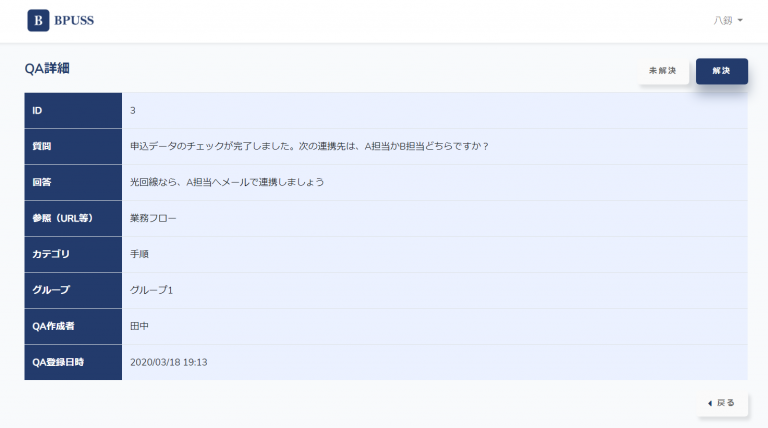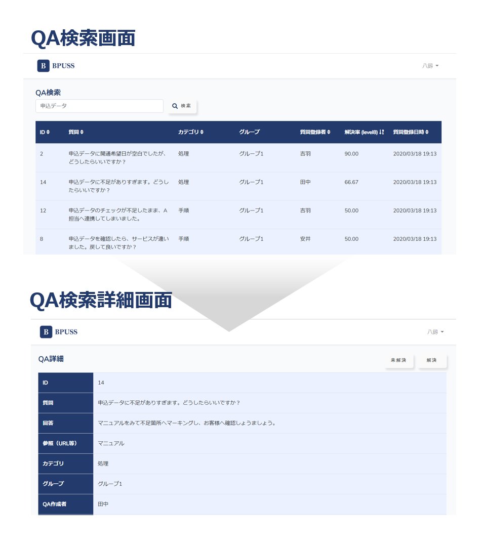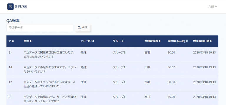 BPUSSでは、QA検索の結果、提示されたアンサーで課題が解決したかどうかをユーザーが評価することが可能です。