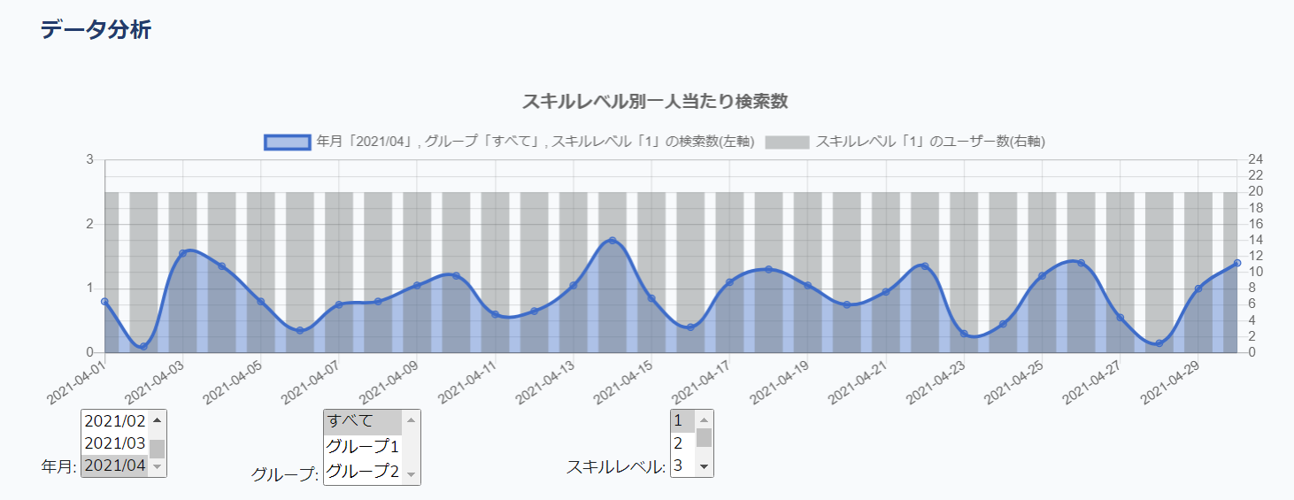 スキルレベルごとにユーザー一人当たりの検索数の推移が確認できます。